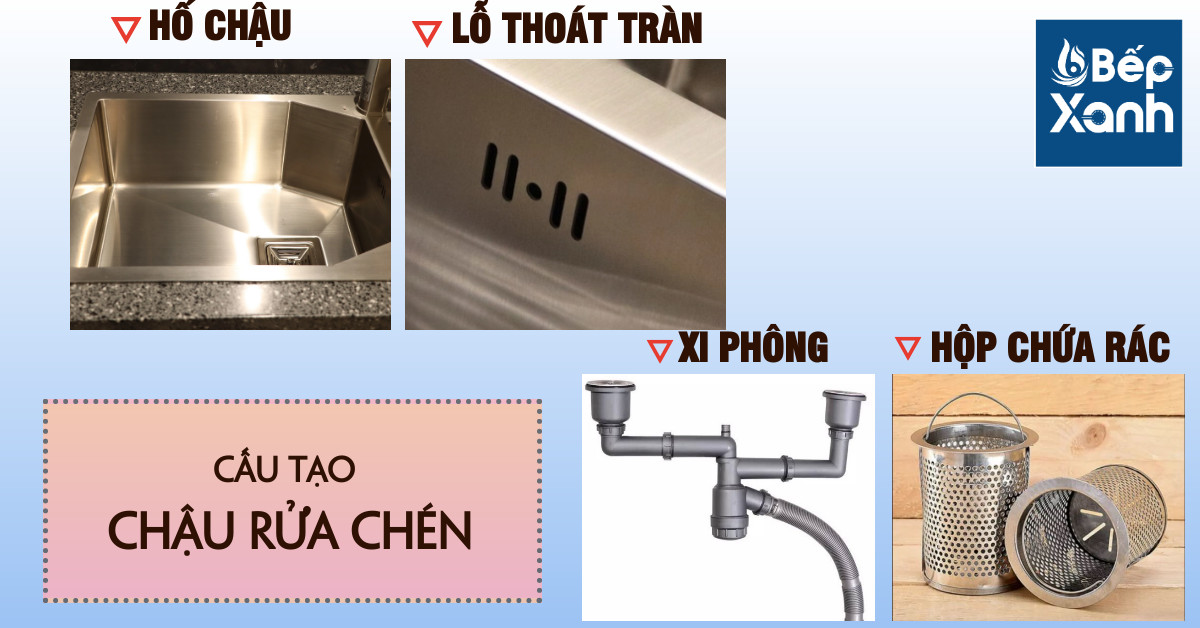 Một chậu rửa bát thường có 4 bộ phận chính là: hồ chậu, xi phông, lỗ thoát tràn hộp chứa rác.
