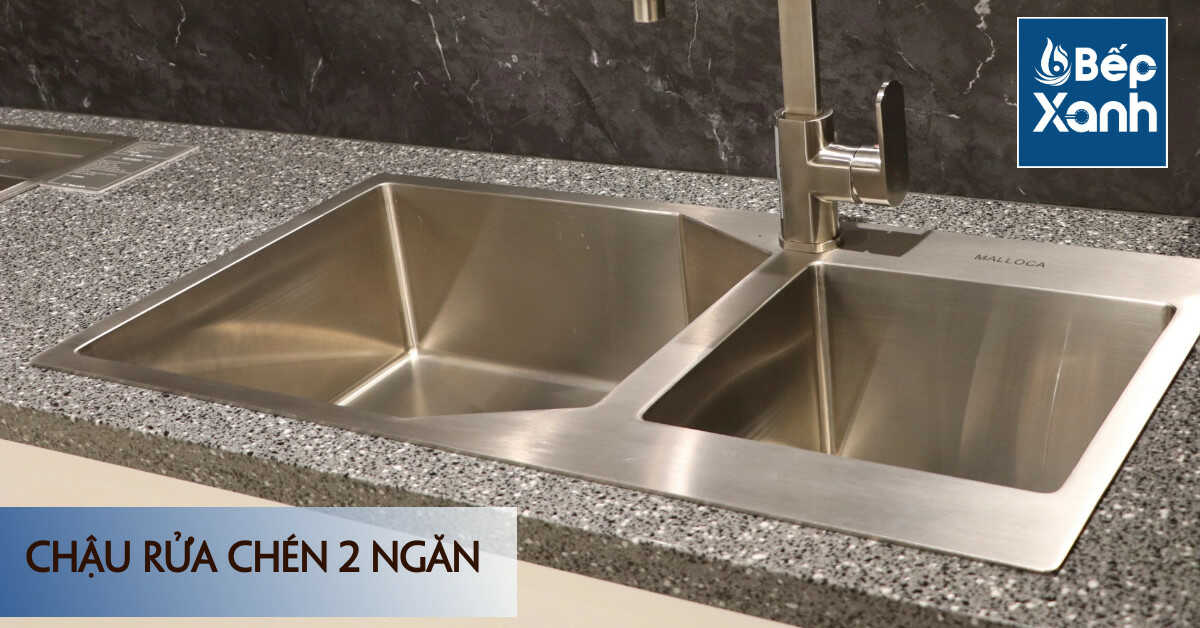 Chậu rửa chén hai ngăn: là thiết kế chậu được ưa chuộng nhất hiện nay. Có loại 2 ngăn bằng nhau, một ngăn lớn và một ngăn nhỏ,…được sử dụng hầu hết tại các hộ gia đình khoảng từ 2 đến 6 người. Chủ yếu loại 2 ngăn giúp chúng ta có thể thực hiện hai công việc một lúc như vừa rửa chén vừa rửa thực phẩm nên phù hợp với nhu cầu đa số người nội trợ.