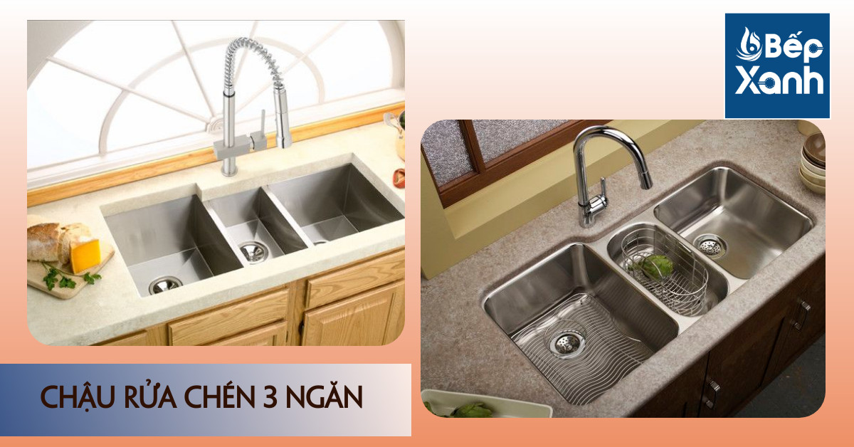 Chậu rửa chén 3 ngăn: Loại này hiếm khi được sử dụng. Đa số chậu rửa 3 ngăn thường xuất hiện tại các nhà hàng hoặc gia đình đông người, khoảng 6 người trở lên. Phù hợp với không gian bếp lớn và nhu cầu về việc chứa đựng và sử dụng nhiều bạn mới nên chọn loại này.