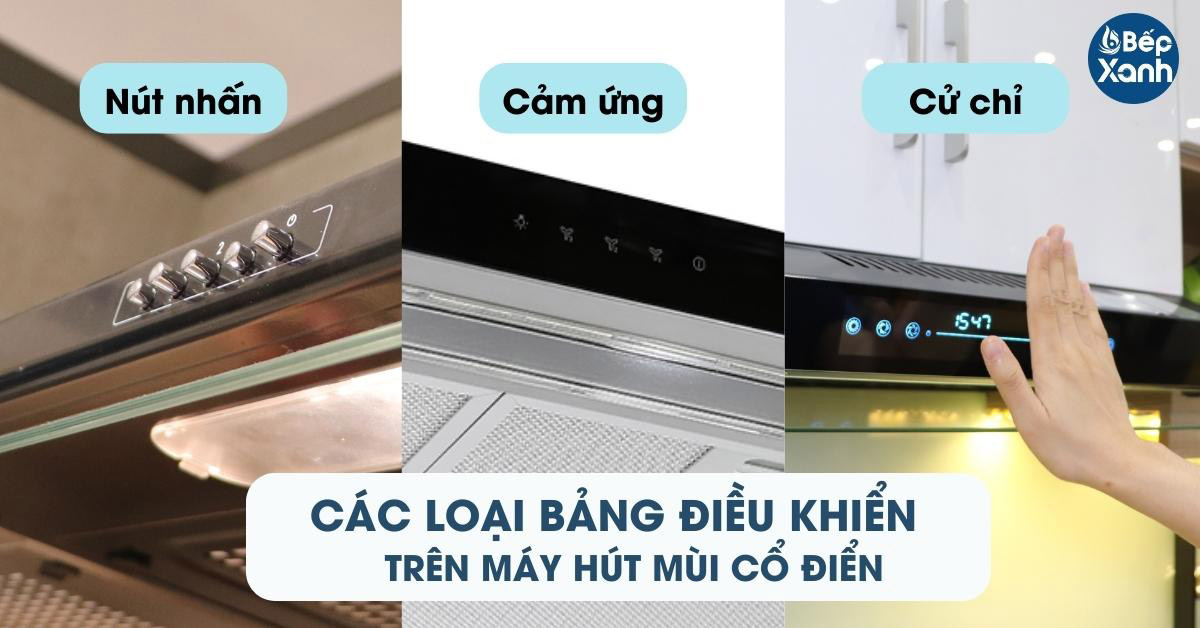 Hiện nay các loại máy của hút mùi cổ điển có ba loại bảng điều khiển là bảng điều khiển cảm ứng, điều khiển bằng cử chỉ và bảng điều khiển vật lý (nút nhấn). Nếu trong gia đình bạn có nhiều người lớn tuổi sử dụng máy thì nên chọn nút ấn vật lý vì chúng đơn giản và dễ thao tác. Còn nếu gia đình bạn là người trẻ, mong muốn có thiết kế sang trọng thì có thể chọn bảng điều khiển cảm ứng hoặc cử chỉ.