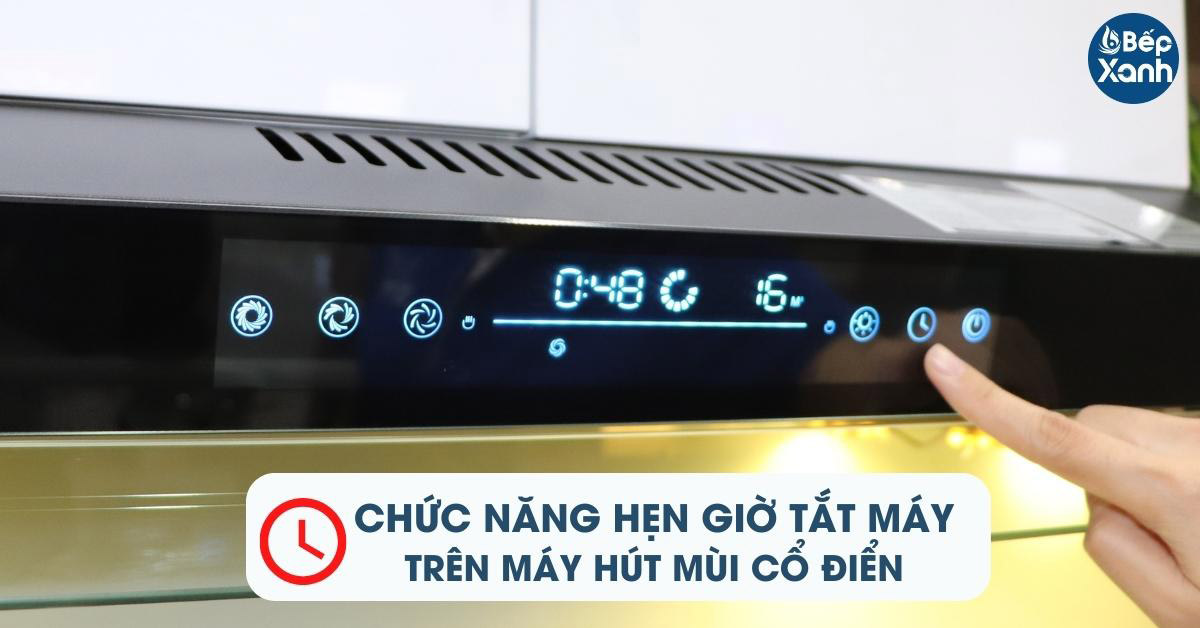 Một số máy hút mùi classic sẽ có chức năng hẹn giờ. Chúng ta chỉ cần nhấn nút hẹn giờ, máy hút khử mùi sẽ tự động tắt sau tầm 3-10 phút (tuỳ thuộc vào cài đặt của từng hãng) kể từ khi thiết lập chức năng này. Bạn sẽ không cần phải canh thời gian tắt cho máy mà vẫn đảm bảo hút mùi triệt để cho bếp sau khi kết thúc quá trình nấu ăn.