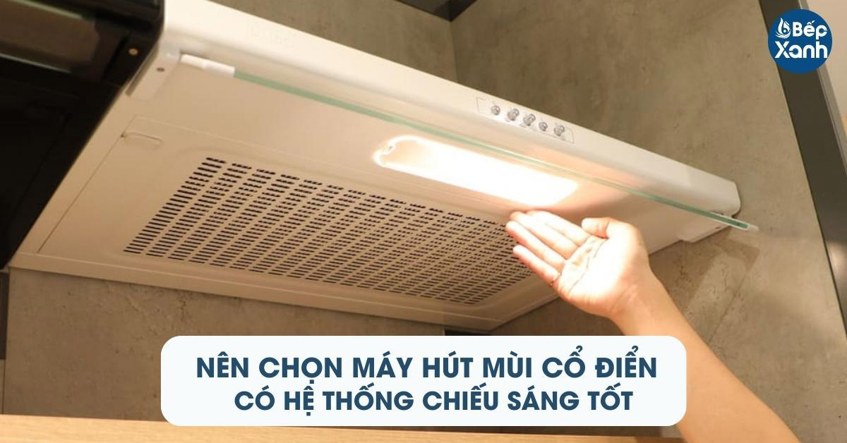 Khả năng chiếu sáng của máy hút mùi cổ điển là một trong những lưu ý quan trọng khi chọn mua sản phẩm. Thông thường các loại máy hút mùi cổ điển sẽ được lắp đặt thêm các đèn LED, đèn Halogen chiếu sáng để giúp bạn thuận tiện trong việc nấu ăn hơn.