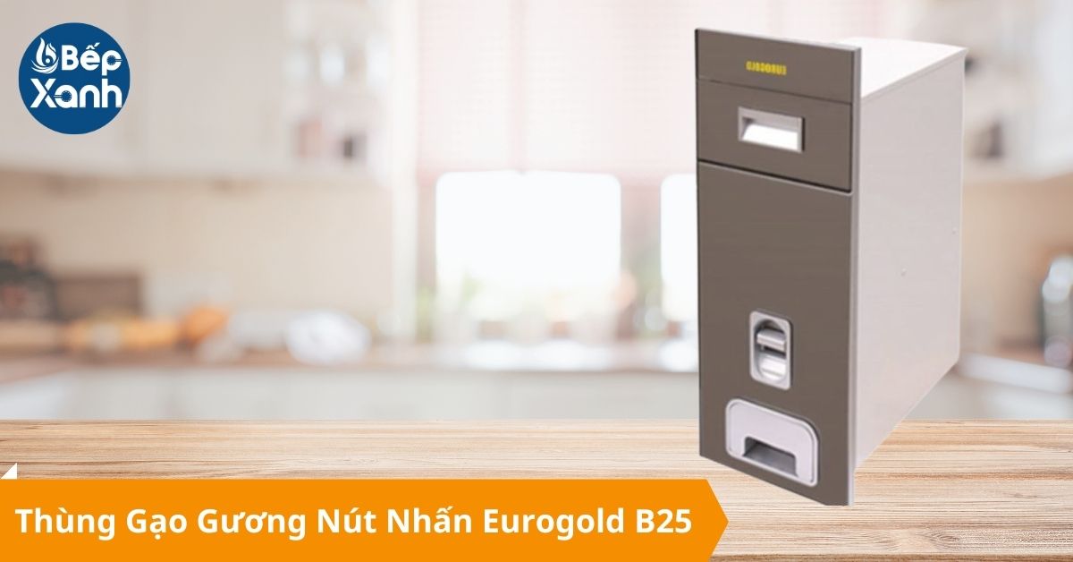 Thùng gạo mặt gương eurogold B25 được thiết kế theo dạng nút nhấn, khi người dùng nhấn vào nút lấy gạo, 150g gạo sẽ nằm gọn ở khay nhựa hứng gạo phía dưới thùng, sẵn sàng để nấu ngay lập tức. Thiết kế thùng đựng gạo có dạng phễu bên trong nên gạo cũ có hạn sử dụng sớm hơn được cho vào trước sẽ nằm ở phía dưới và được đưa ra để nấu trước, hạn chế được tình trạng gạo để lâu ngày quá hạn gây mốc.