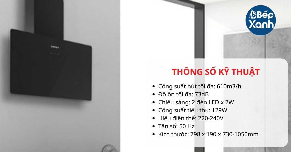 Nếu bạn cần một chiếc máy hút mùi áp tường tiết kiệm năng lượng và phù hợp cho gian bếp nhỏ thì đây là lựa chọn hoàn hảo. Bởi kích thích của máy có chiều ngang 69.8 cm dễ dàng thiết kế và lắp đặt trong khu vực bếp của đa số người Việt.