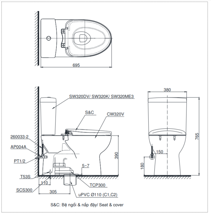 Thông tin cơ bản của bàn cầu hai khối CS320PDRW7: