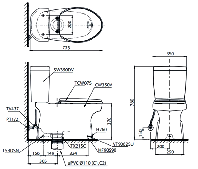 Bản vẽ kỹ thuật Bàn Cầu Hai Khối ToTo CS350DE2