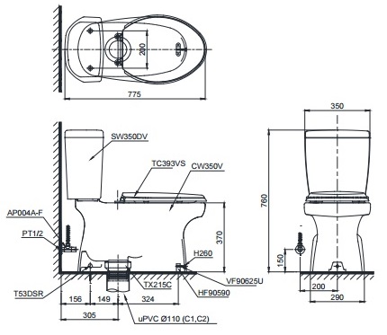 Bản vẽ kỹ thuật Bàn Cầu Hai Khối ToTo CS350DT3#W