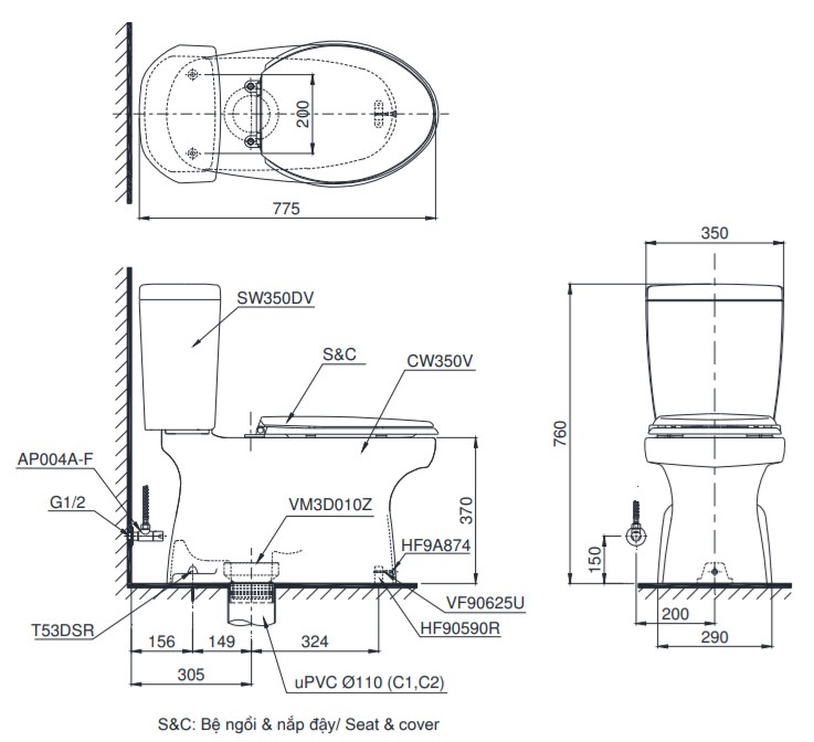 Thông tin cơ bản của bàn cầu hai khối CS350DW11: