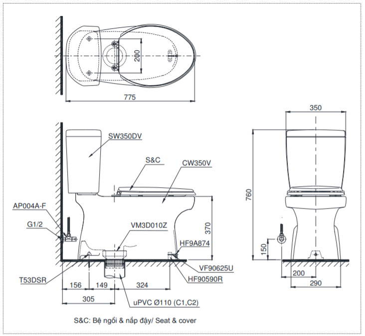 Thông tin cơ bản của bàn cầu hai khối CS350DW6: