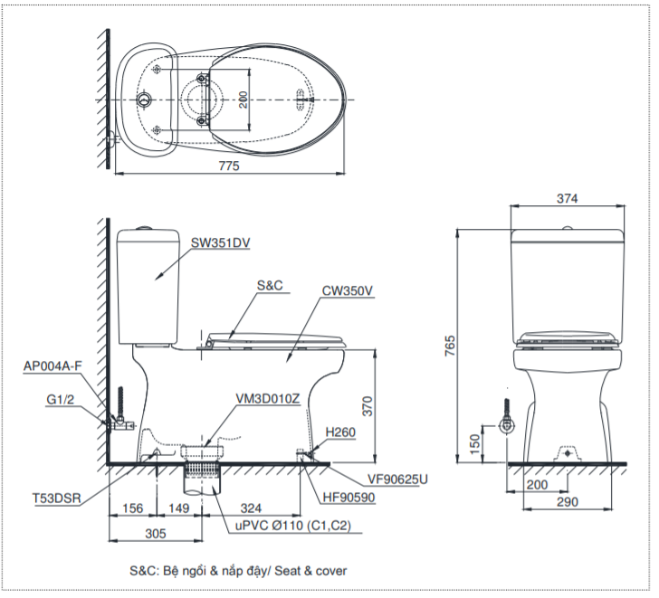 Thông tin cơ bản của bàn cầu hai khối CS351DW7: