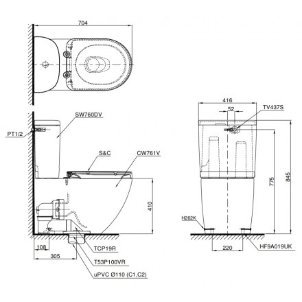 Bàn cầu hai khối toto CS761DW8 kèm nắp rửa điện New Washlet đa chức năng, men sứ chống dính Cefiontect