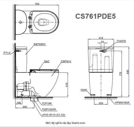 Bản vẽ kỹ thuật bàn cầu hai khối CS761PDE5