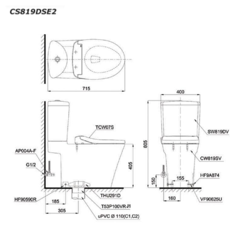 Thông tin cơ bản bồn cầu TOTO CS819DSE2 nắp rửa cơ