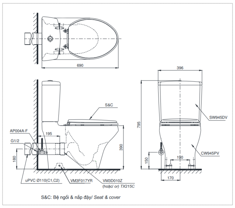 Bản vẽ thiết kế của bàn cầu hai khối CS945PDE4#XW, nắp đóng êm:
