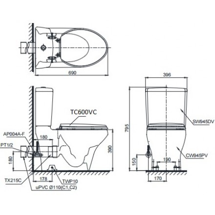 Bản vẽ kỹ thuật Bàn Cầu Hai Khối ToTo CS945PDT8#W