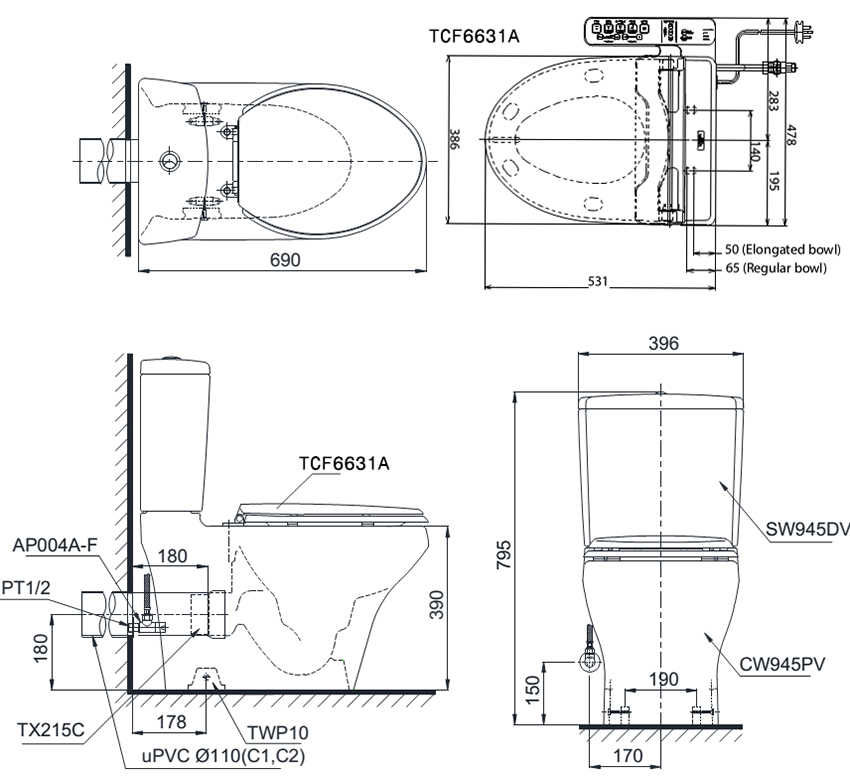 - Phù hợp lắp đặt với nắp rửa điện tử WASHLET (tùy chọn)