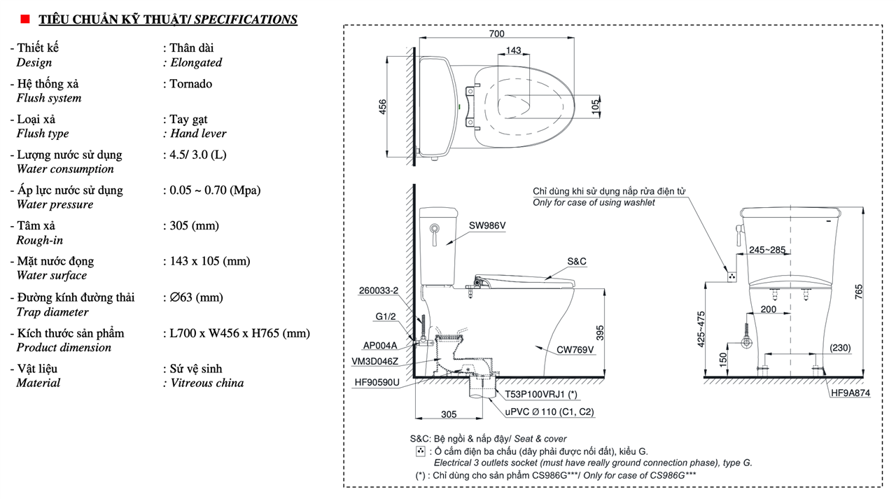 - Phù hợp lắp đặt với nắp rửa điện tử WASHLET (tùy chọn)