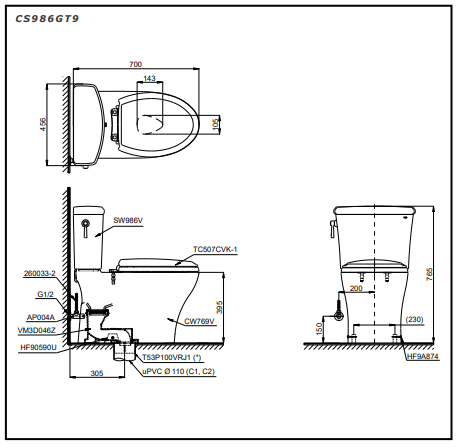 Kích thước bàn cầu hai khối TOTO CS986GT9
