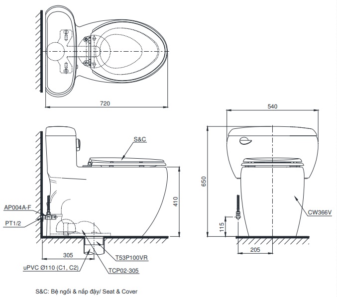 Bản vẽ kỹ thuật Bàn Cầu Một Khối ToTo MS366W11