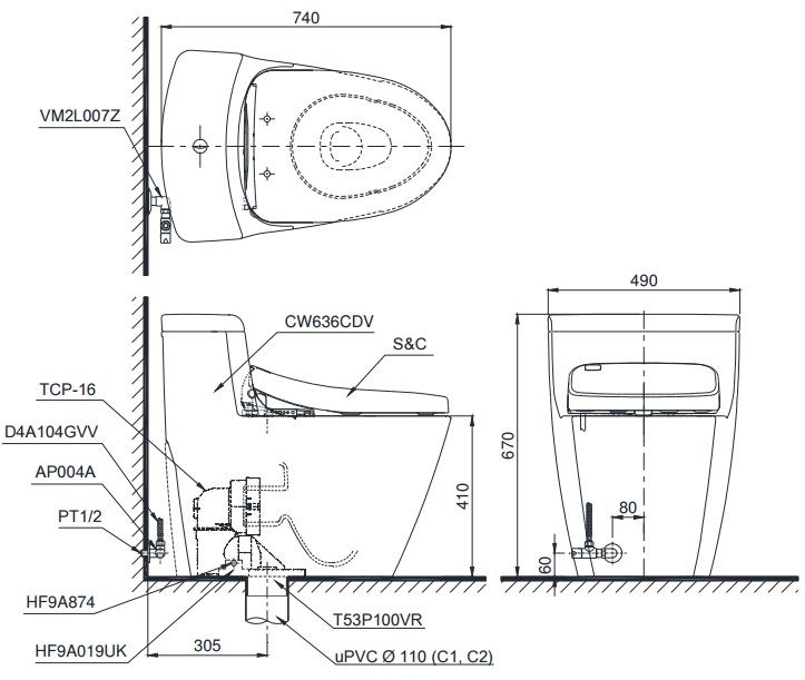 Bản vẽ kỹ thuật xí bệt TOTO MS636DT