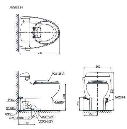 Bản vẽ kỹ thuật Bàn Cầu Một Khối ToTo MS688E4#XW