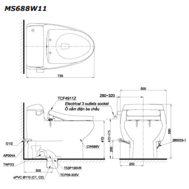 Bản vẽ kỹ thuật bàn cầu một khối MS688W11