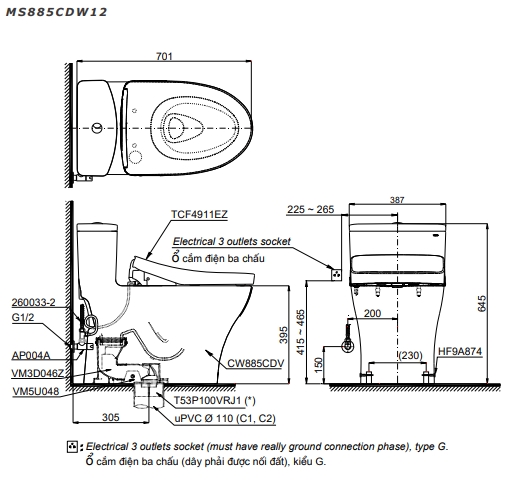 Bản vẽ kỹ thuật Bàn cầu 1 khối ToTo MS885DW12#XW