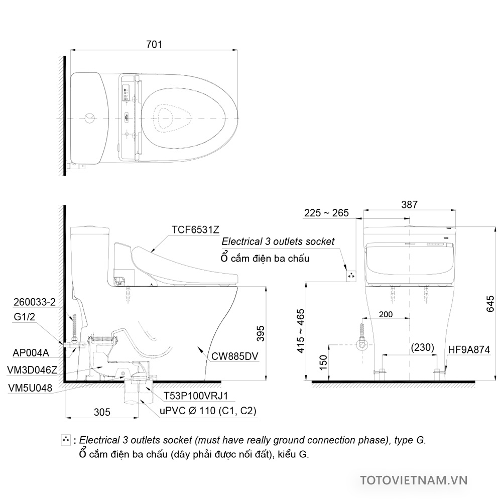 Kích thước bàn cầu một khối TOTO MS885DW6