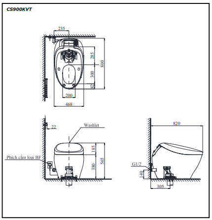 Kích thước bàn cầu TOTO CS900KVT/T53P100VR