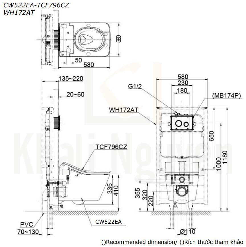 Thông số thân bồn cầu treo tường TOTO CW522EA/TCF796CZ/WH172AT