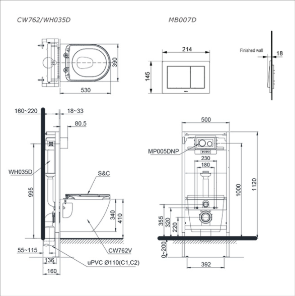 Bản vẽ kỹ thuật bàn cầu treo tường CW762/TC384CVK