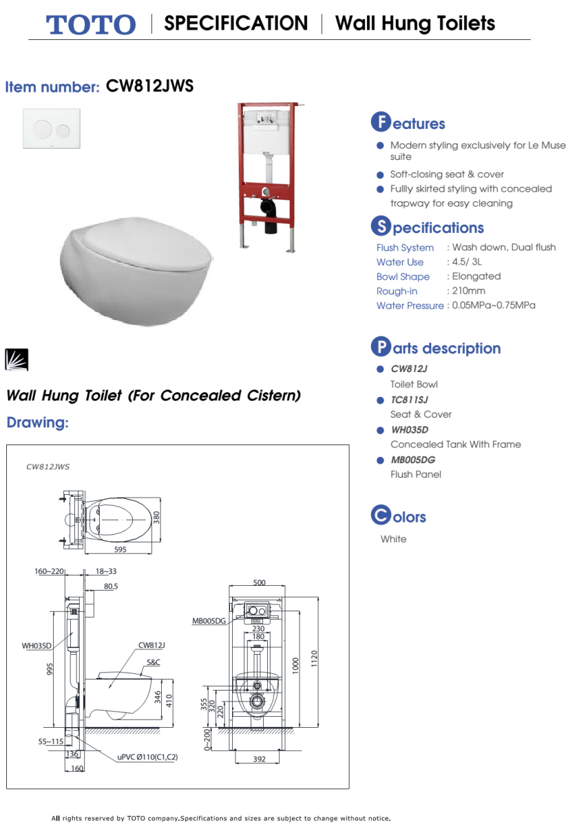 - Tên sản phẩm: Bồn cầu toto treo tường CW812JWS-TC811SJ