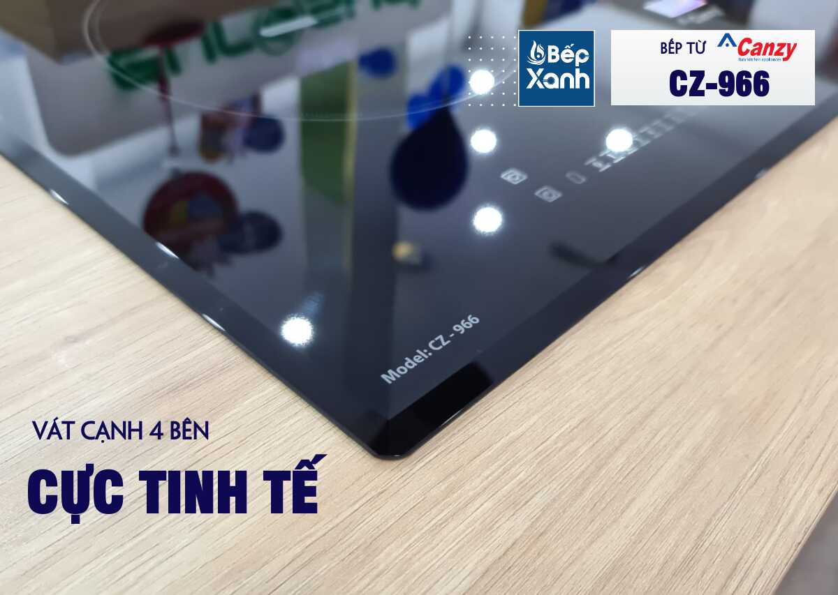 Mặt kính vát cạnh tuyệt đẹp:Mặt kính của bếp Canzy CZ-966 được vát cạnh trước và sau, tăng độ thẩm mỹ cho sản phẩm và tiện lợi khi lau chùi.