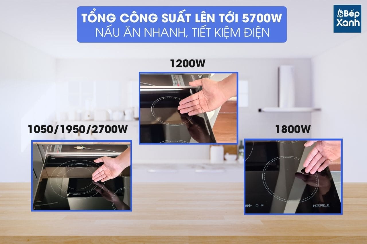 - Ba vùng nấu của bếp có kích thước và mức công suất khác nhau để phù hợp với kích cỡ xoong nồi cũng như nhu cầu nấu ăn, với tổng công suất cao lên tới 5700W giúp nấu ăn nhanh chóng, tiết kiệm điện năng cho gia đình.