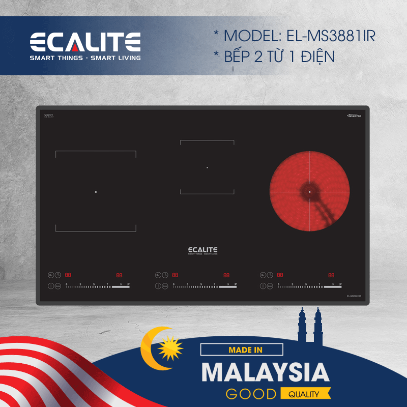 Bếp điện từ 3 vùng nấu Ecalite EL-MS3881IR được sản xuất chính hãng nguyên chiếc tại Malaysia. Sản phẩm có thiết kế hiện đại, kết cấu chắc chắn, kết hợp với mặt kính Schott Ceran cao cấp đem đến độ bền cực kì cao khi sử dụng