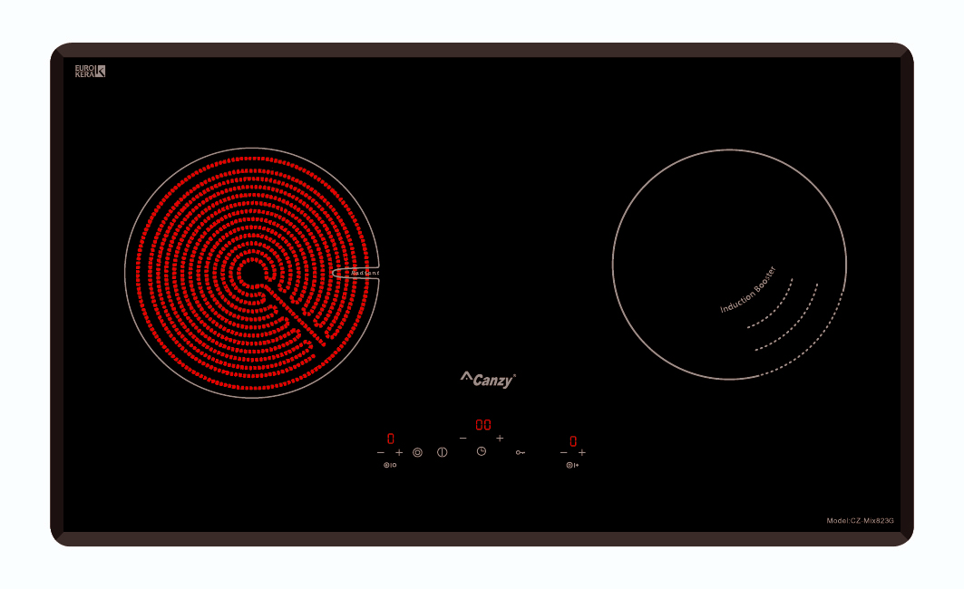 Bếp điện từ Canzy CZ-MIX823G gồm 2 vùng nấu, 1 vùng nấu từ có khả năng đun nấu siêu nhanh và tiết kiệm điện năng với công suất 1500W có thể đạt mức công suất tối đa Booster 2000W và 1 vùng nấu hồng ngoại sử dụng mâm nhiệt EGO 2 vòng nhiệt với vòng nấu nhỏ bên bếp hồng ngoại có công suất 800W và vòng nấu lớn của bếp hồng ngoại có công suất 1900W.