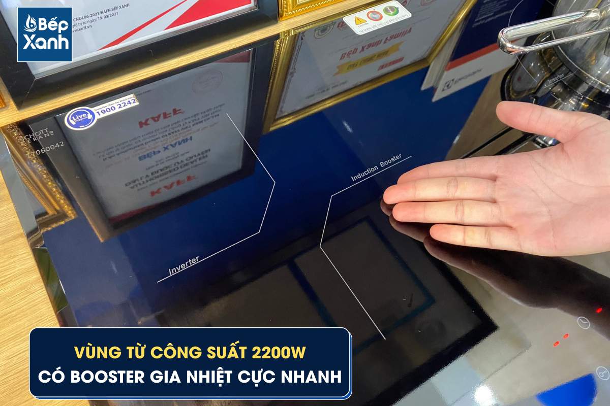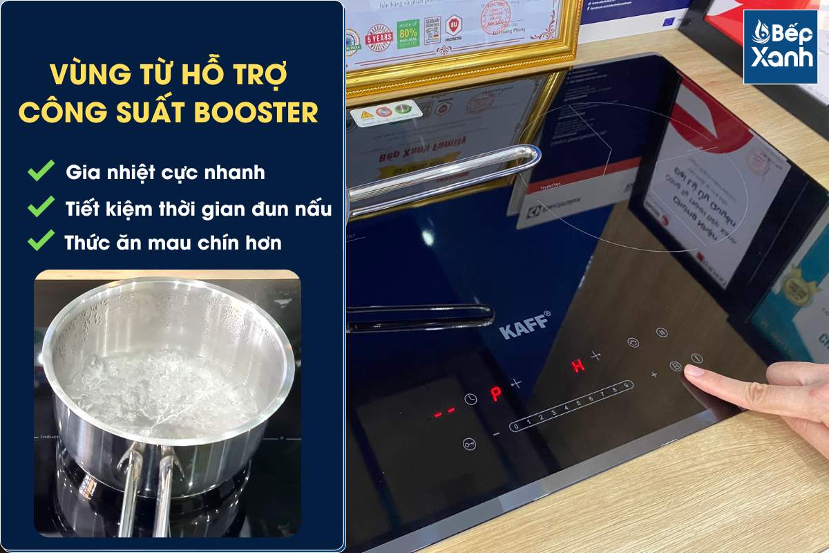 Booster là chức năng giúp bếp từ gia tăng nhiệt nhanh chóng trên các vùng nấu, với mức công suất của bếp khi sử dụng Booster vượt qua công suất định mức của bếp, cao gấp 1,2 đến 1,5 lần so với mức công suất cao nhất của bếp. Nhờ đó giúp người dùng thực hiện món ăn cực nhanh chóng, phù hợp đun sôi nước để nấu canh, luộc rau,…