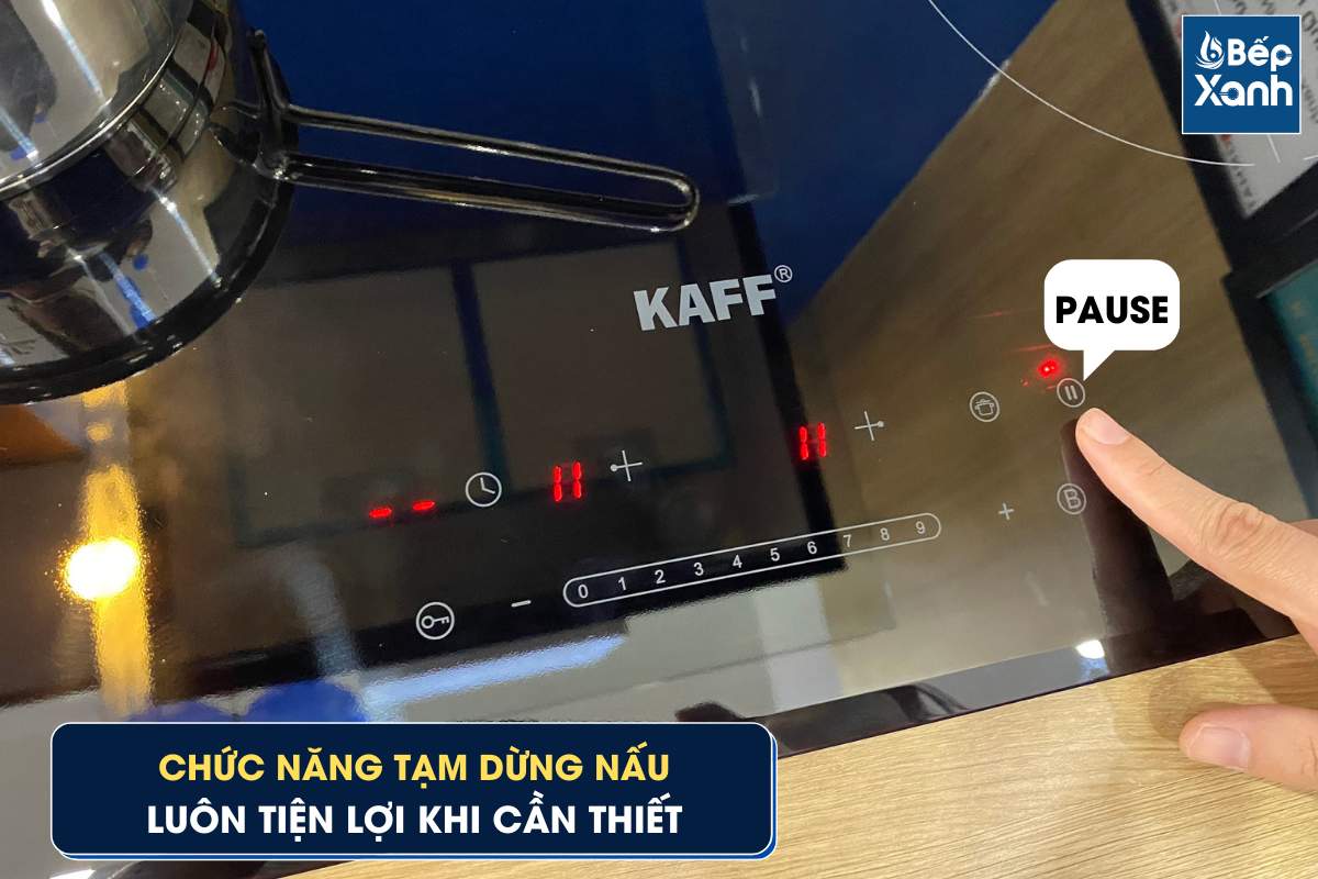 Trong quá trình nấu nướng không thể tránh khỏi việc bạn cần đi vệ sinh, nghe điện thoại, mở cửa cho khách, lấy đồ,... mỗi lần như vậy mà tắt bếp sau đó bật lại từng bếp và điều chỉnh nhiệt độ sẽ rất mất thời gian, vì vậy nhấn nút tạm dừng để bạn có thể tiết kiệm được thời gian của mình. Chức năng này cho phép bạn tạm dừng hoạt động nấu của bếp tạm thời và tái khởi động lại các chức năng một cách nhanh chóng và đơn giản nhất. Ký hiệu chức năng tạm dừng trên bếp điện từ Kaff là hình dấu mũi tên với 2 gạch dọc rất dễ nhận biết.