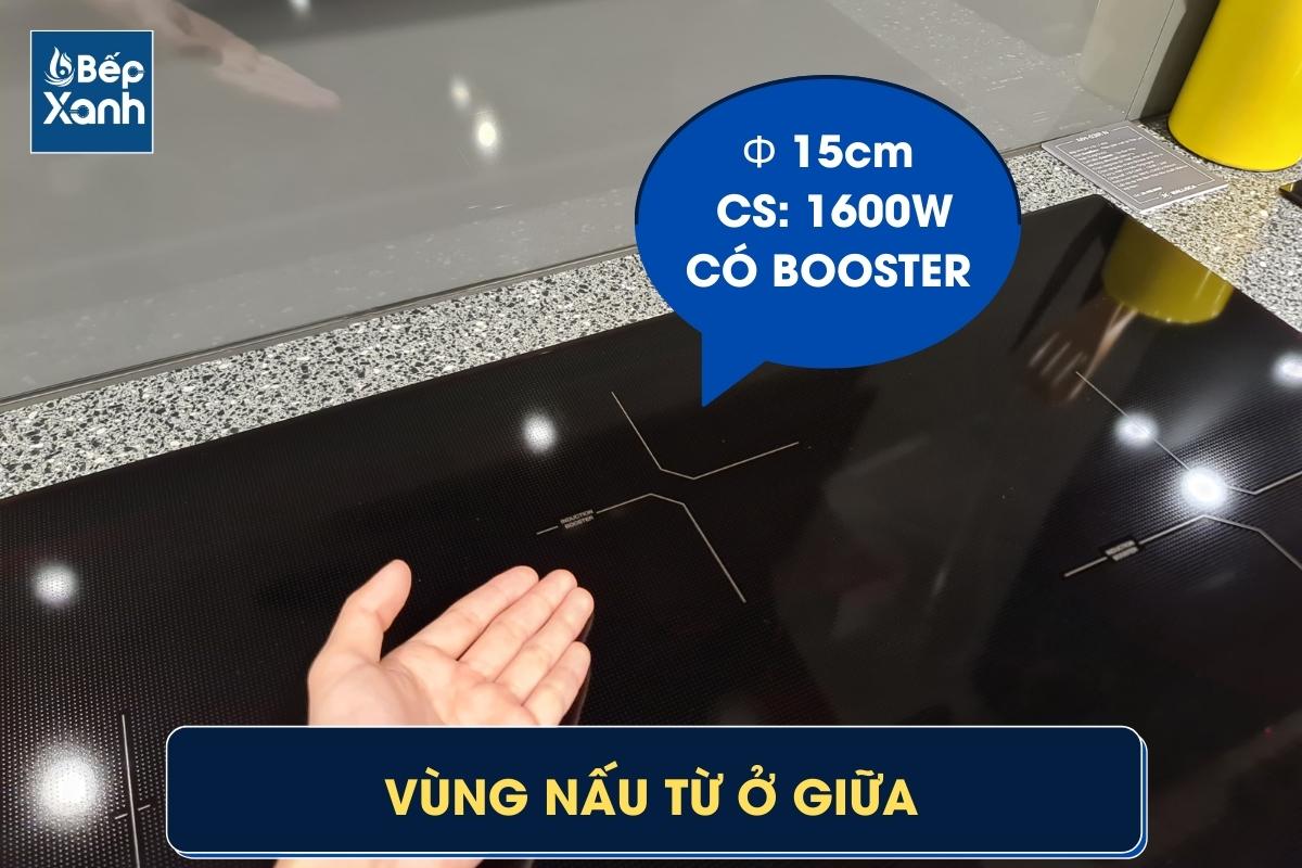 Tương tự vùng nấu từ bên phải, vùng từ ở giữa cũng có hỗ trợ mức công suất Booster nấu nhanh và chỉ nhận điện nồi chảo có đáy nhiễm từ. Vùng nấu có đường kính 15cm, phù hợp xoong nồi kích thước nhỏ, công suất tối đa đạt đến 1600W.