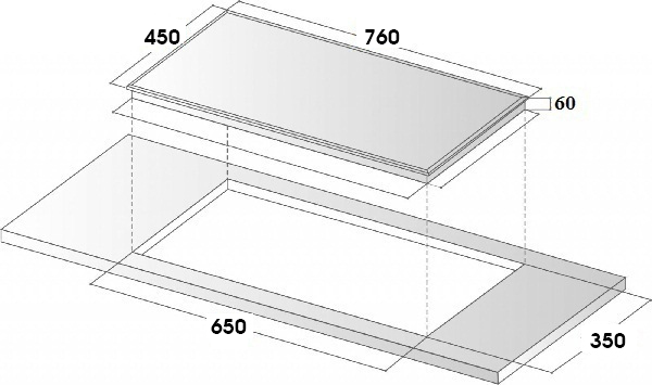 - Kích thước mặt bếp: 760R * 450S * 60C
