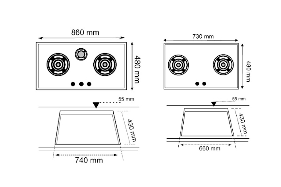Kiềng bếp bằng gang Mặt kiếng chịu nhiệt, vát cạnh Kiềng bếp bằng gang Hệ thống ngắt ga an toàn Đánh lửa bằng pin (1,5V) 02 bếp 03 vòng lửa, công suất 4,3kW |