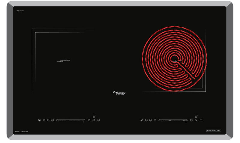Bếp đôi hồng ngoại điện từ Canzy CZ-ML757IH là dòng sản phẩm bếp hỗn hợp điện từ hồng ngoại của thương hiệu uy tín có mặt trên thị trường đồ gia dụng Canzy. Bếp từ kết hợp hồng ngoại này được sản xuất và lắp ráp tại Malaysia với hệ thống mạch, mâm sản xuất theo công nghệ Châu Âu vừa đảm bảo tính thẩm mỹ trong thiết kế, vừa đảm bảo các tính năng tiên tiến, hiện đại đáp ứng nhu cầu tối đa cho người dùng. Hơn nữa, sản phẩm Canzy CZ-ML757IH là hàng chính hãng với thiết kế mặt kính cao cấp, sáng bóng, lắp đặp âm bàn, mang đến sự sang trọng cho không gian bếp.