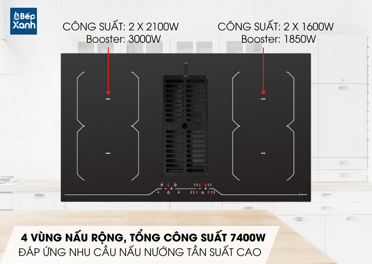 - Vùng nấu bên trái: 2 X 2.1kW (Booster 3kW).