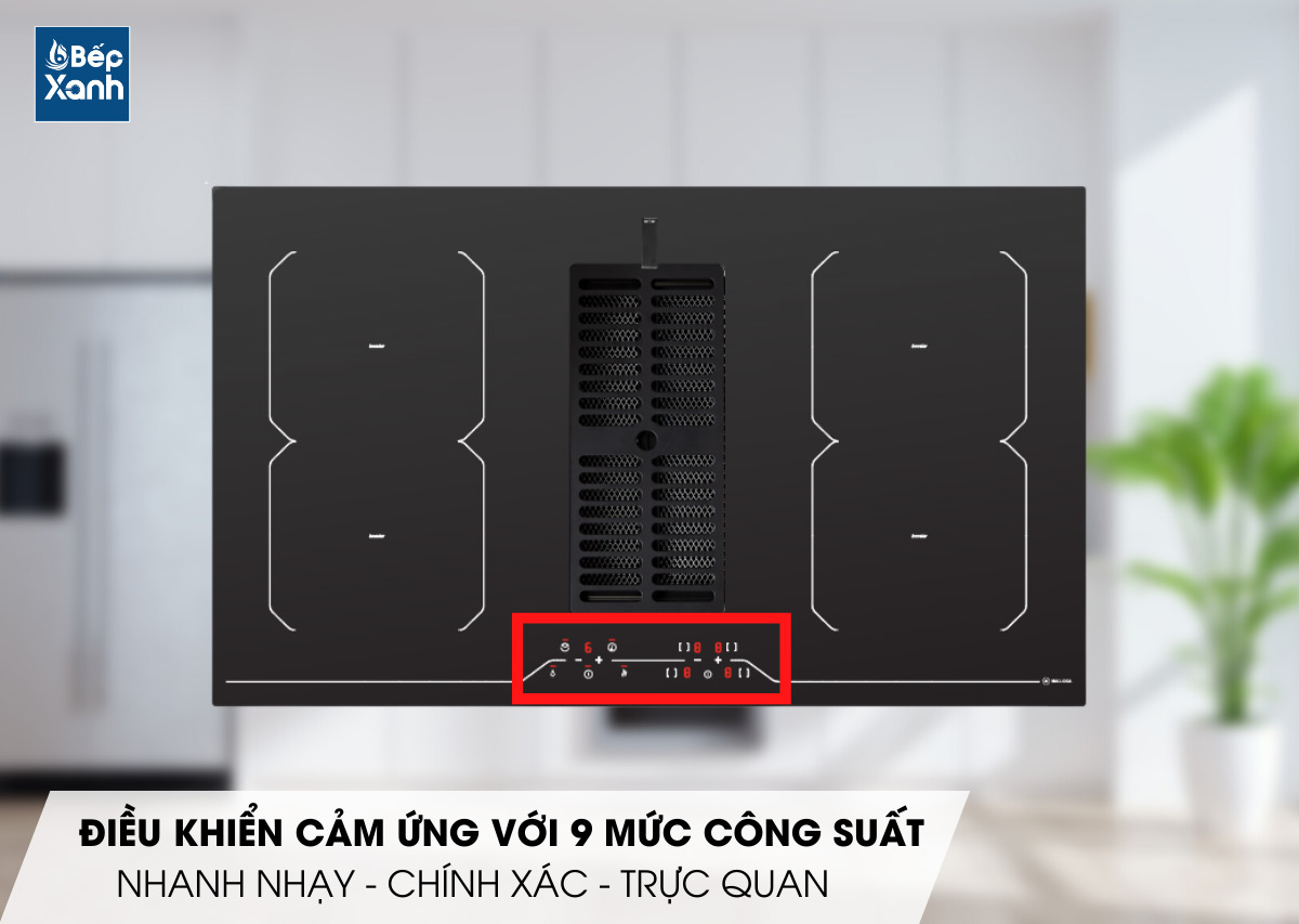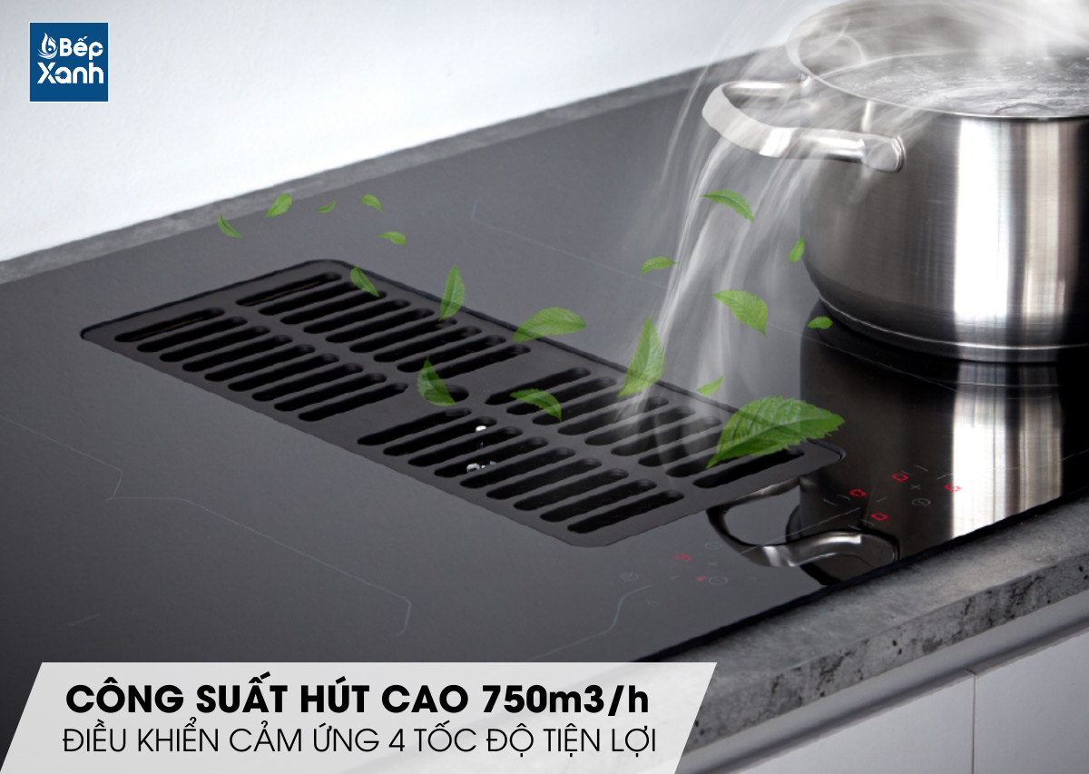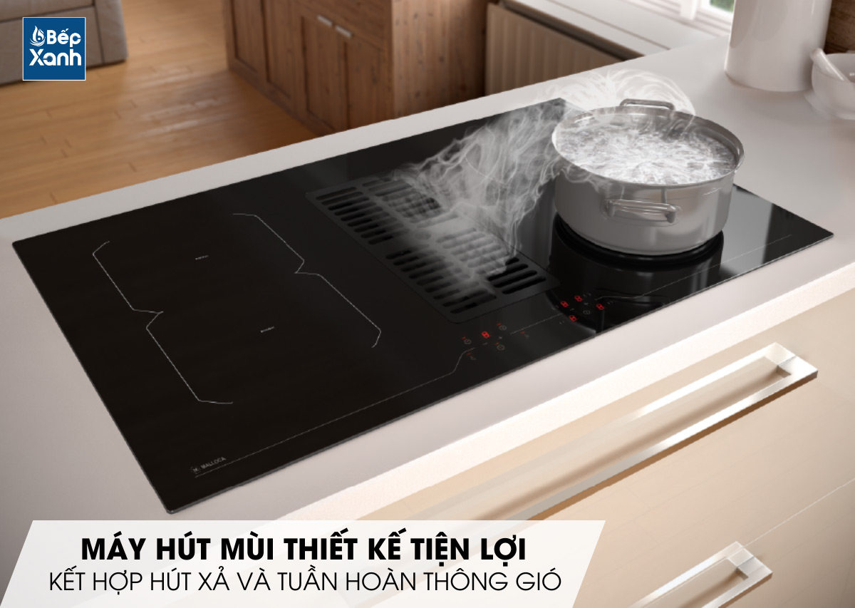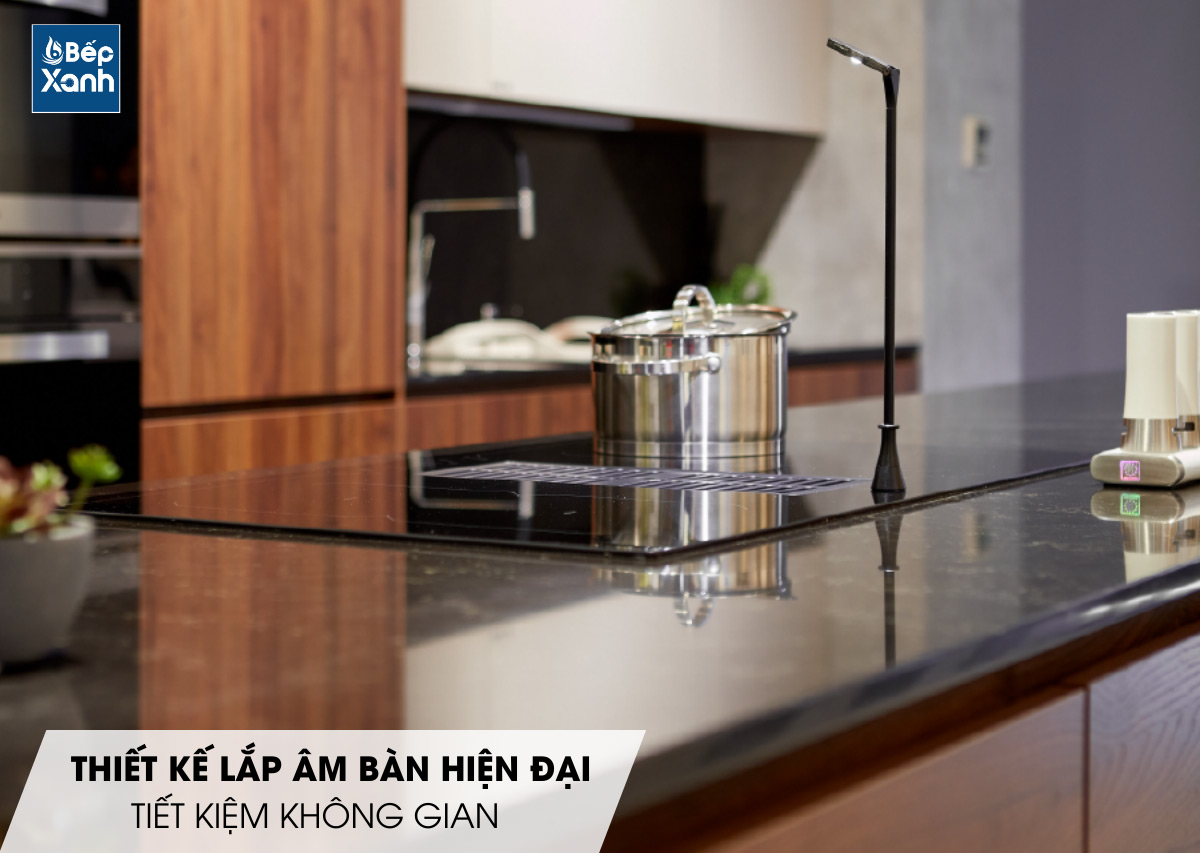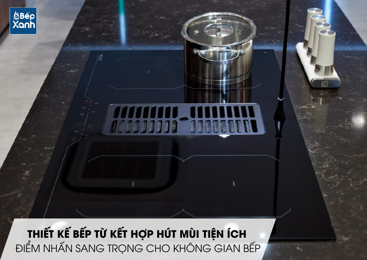 Bếp từ kết hợp máy hút mùi được thiết kế lắp âm với mặt kính mỏng tinh tế, sắc đen trung tính tạo sự hiện đại sang trọng, dễ phối hợp với các thiết bị bếp khác. Đặc biệt, với kiểu thiết kế này có khả năng tiết kiệm diện tích bếp hiệu quả, tạo nên chiều sâu cho không gian bếp.