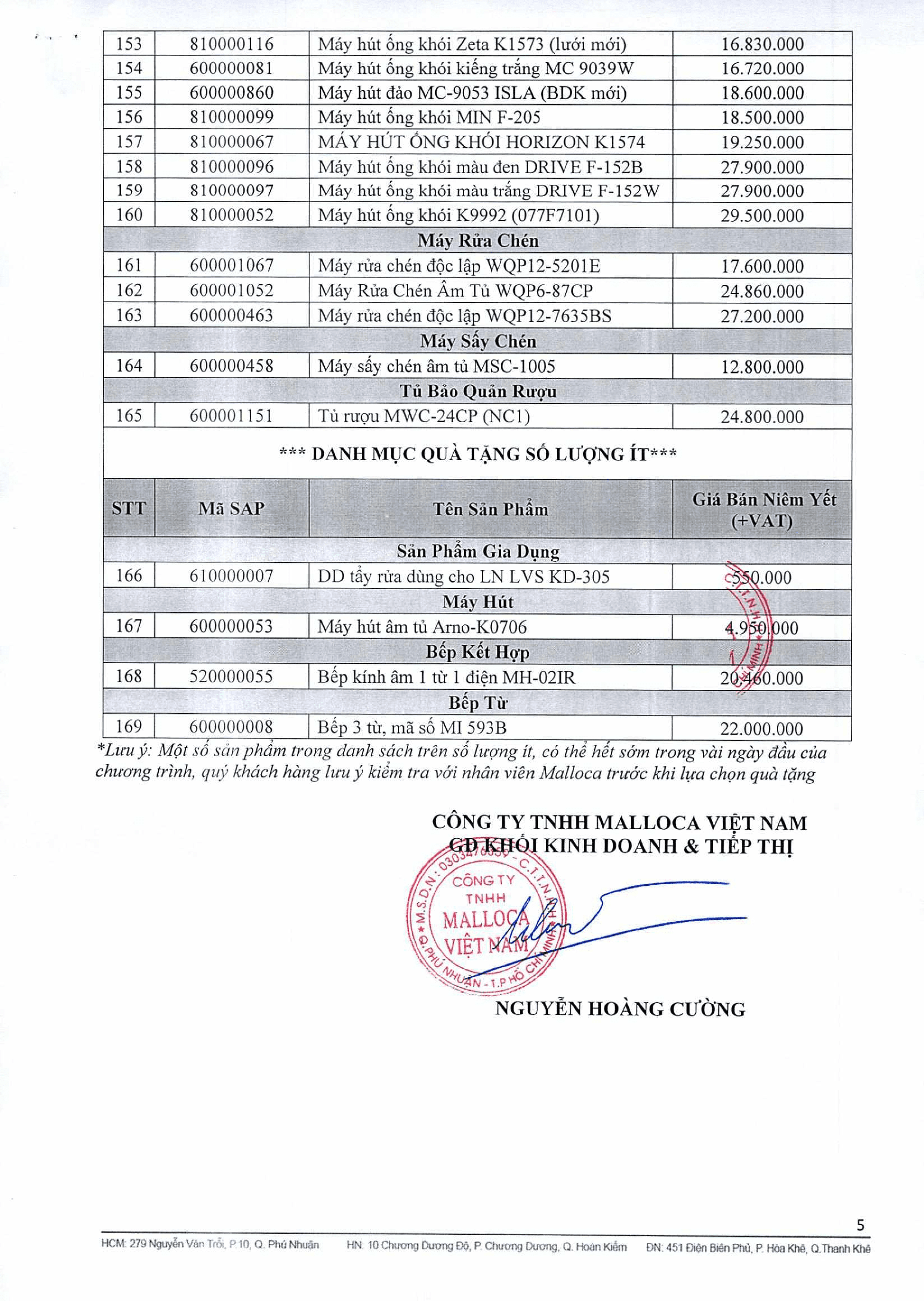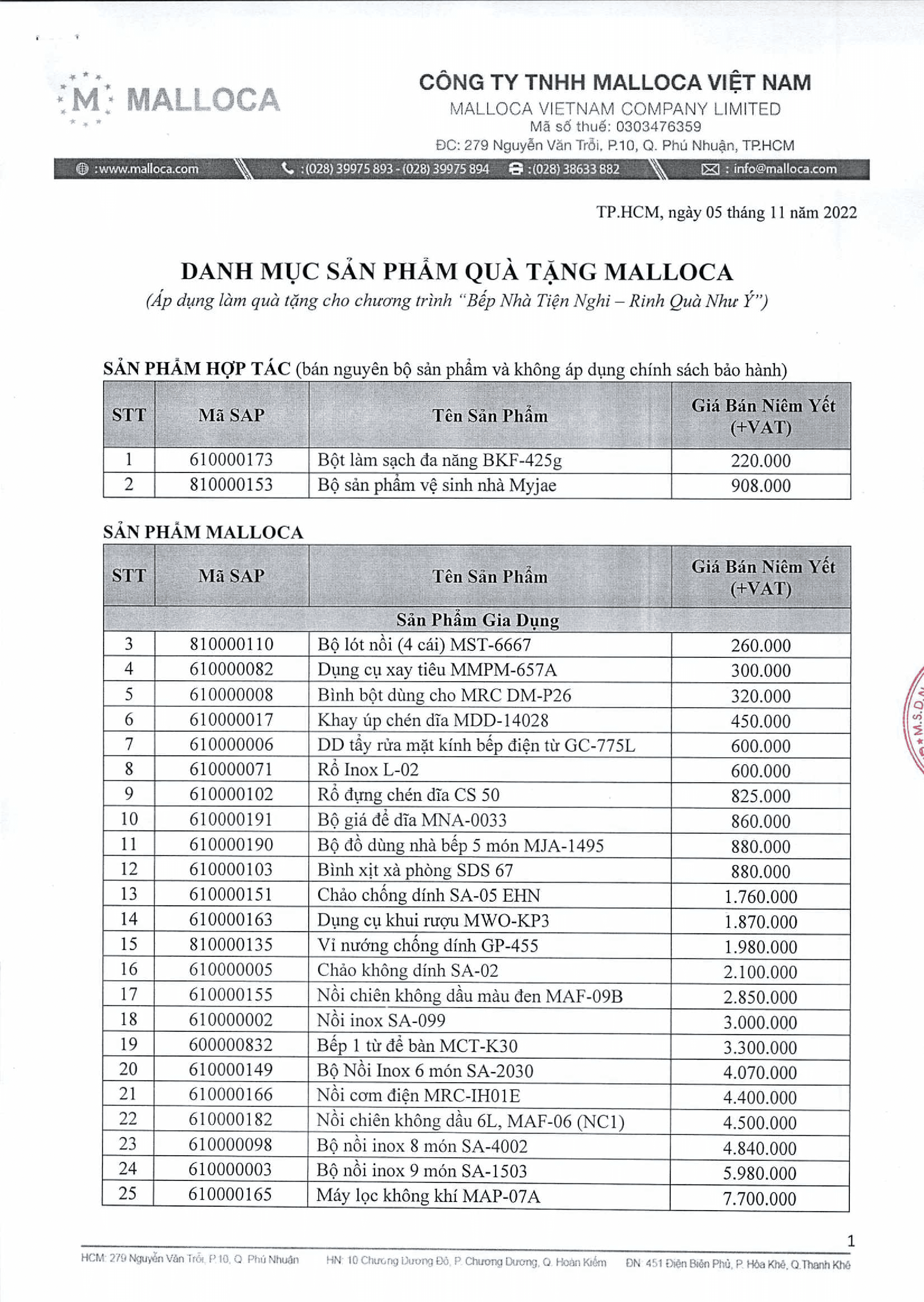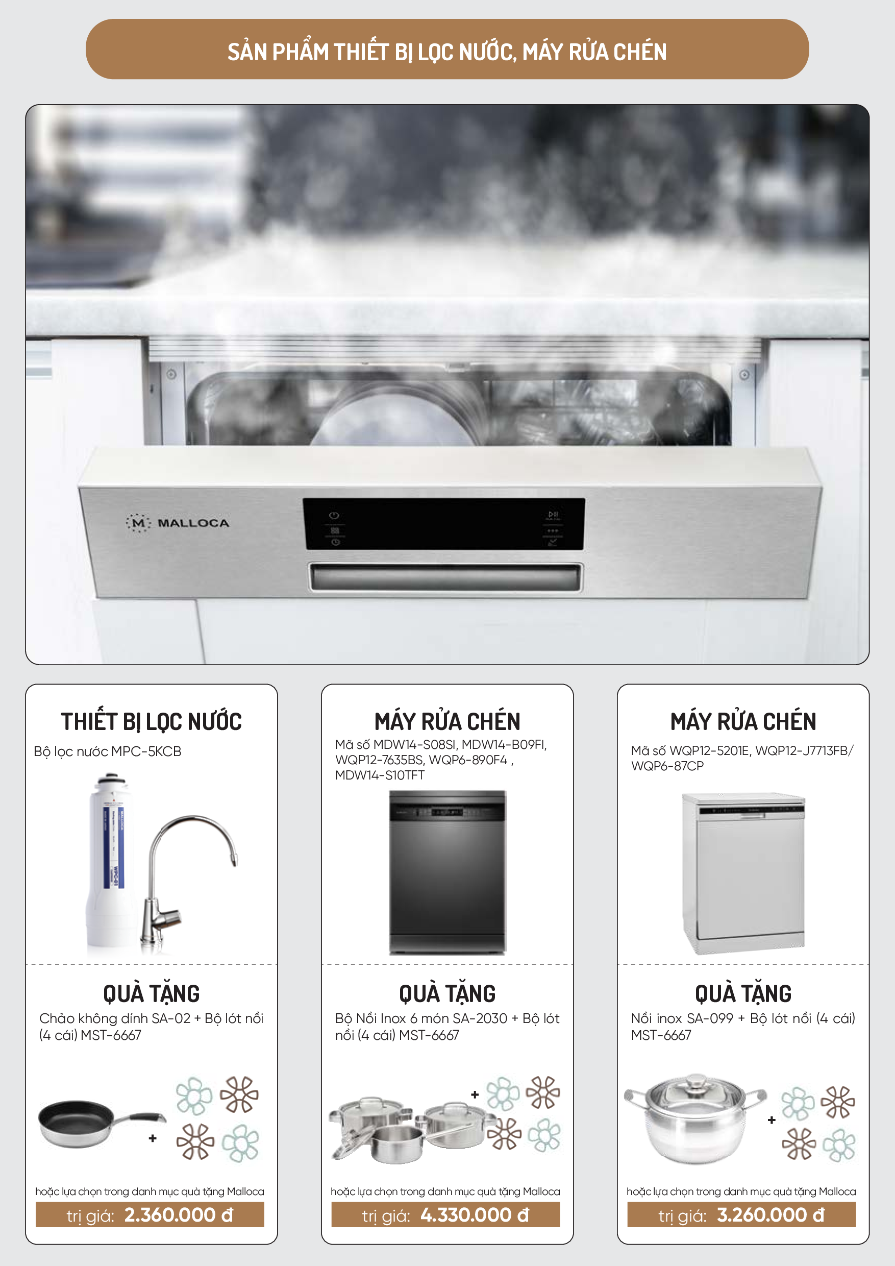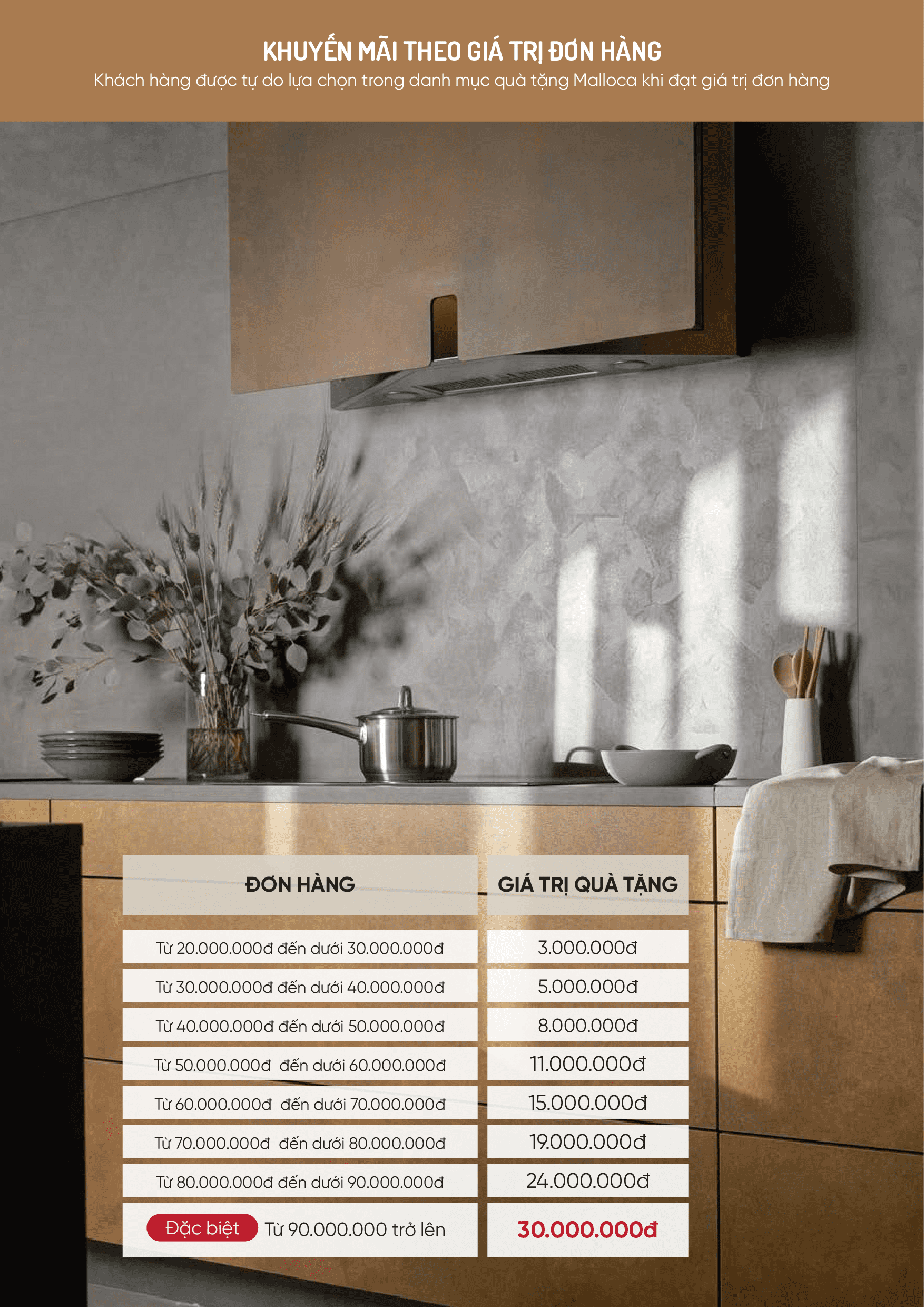 Theo đó, khi mua các sản phẩm của hãng thiết bị bếp Malloca trong chương trình khuyến mãi, khách hàng sẽ nhận được quà tặng với nhiều trị giá khác nhau. Khách hàng lựa chọn 1 trong 2 mục khuyến mãi A - theo sản phẩm hoặc B - theo giá trị đơn hàng.Chương trình hiện tại được áp dụng tại tất cả các showroom Bếp XANH.