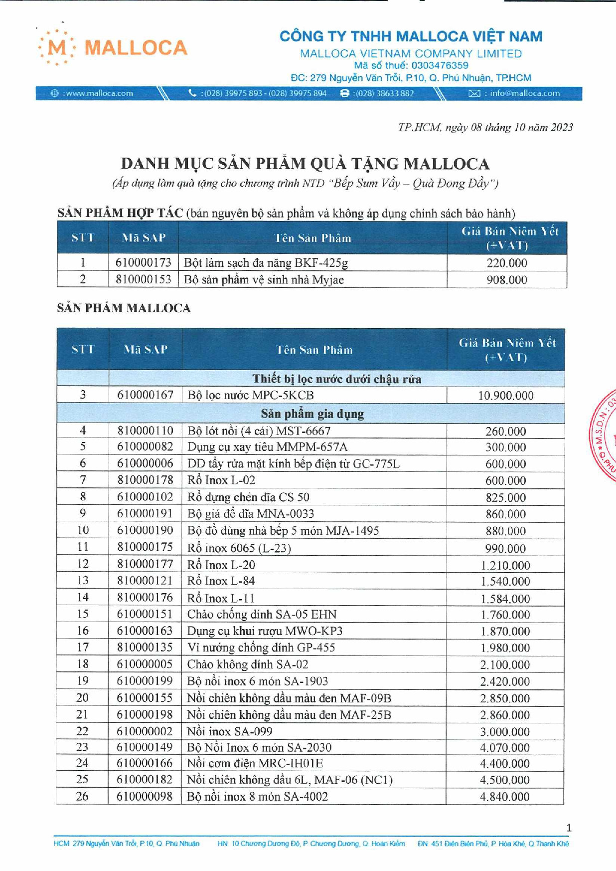 Chương trình khuyến mãi "Bếp Sum Vày - Quà Đong Đầy" diễn ra từ 11/12/2023 đến hết ngày 27/01/2024, giá trị quà tặng đến 30triệu đồng. Đây là ưu đãi lớn dịp Tết của Malloca giúp quý khách hàng mua sắm sản phẩm với nhiều quà tặng hấp dẫn.