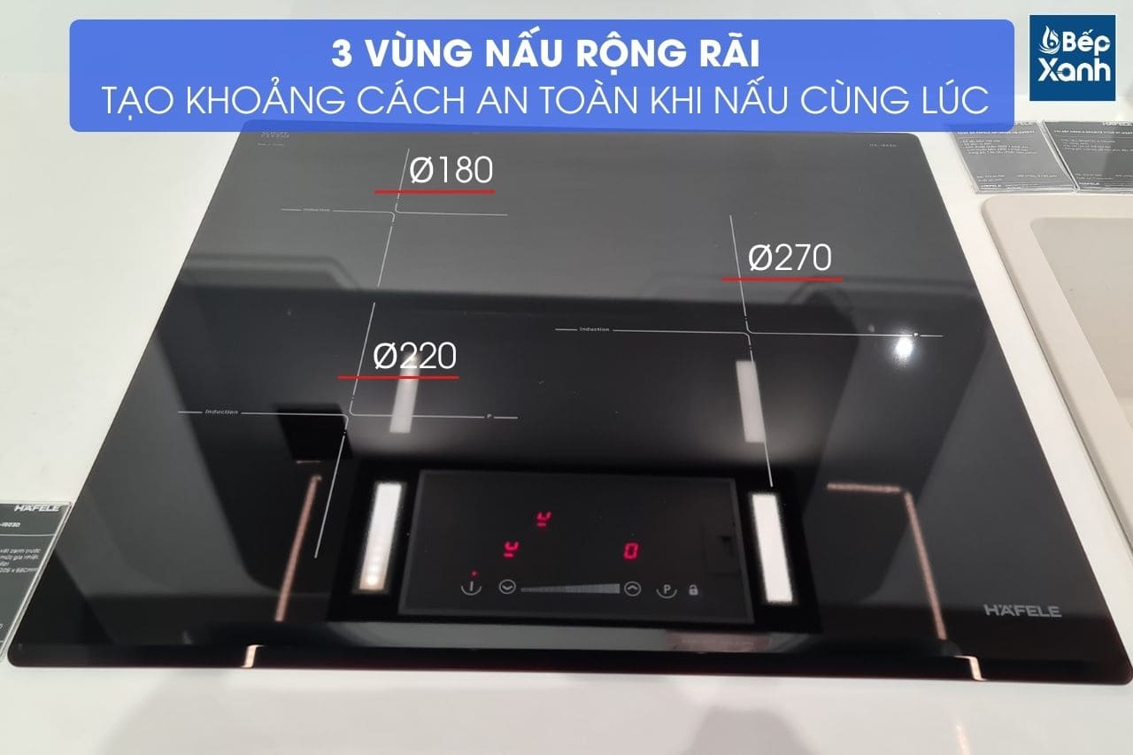 Bếp từ Hafele HC-I603D 536.61.631 được thiết kế với 3 vùng nấu gọn gàng, phía bên trái là 2 vùng nấu từ có vòng nhiệt lần lượt là 220 mm và 180 mm, vùng từ bên phải có kích thước vòng nhiệt lớn 270 mm. Ba vùng nấu được phân bổ hợp lý giúp người dùng nấu ăn cùng lúc dễ dàng, phù hợp nhiều kích cỡ xoong nồi khác nhau, đáp ứng tốt nhu cầu nấu nướng cho gia đình 3 - 4 người.