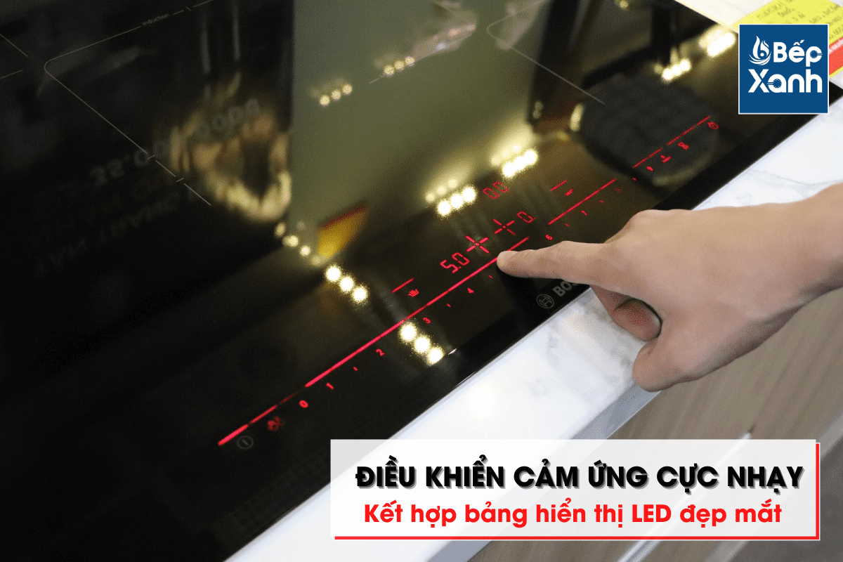 Bếp PID675DC1E được hãng Bosch trang bị bảng điều khiển bằng cảm ứng cực nhạy, có thể thao tác dễ dàng ngay cả khi tay ướt. Song song đó, hệ thống đèn Led đỏ nổi bật chạy dài theo cạnh máy giúp bạn dễ quan sát và thao tác hơn. Các ký hiệu trên mặt bếp cũng rất trực quan và dễ nhận biết nên người lớn tuổi trong nhà vẫn có thể sử dụng bếp thuận tiện.