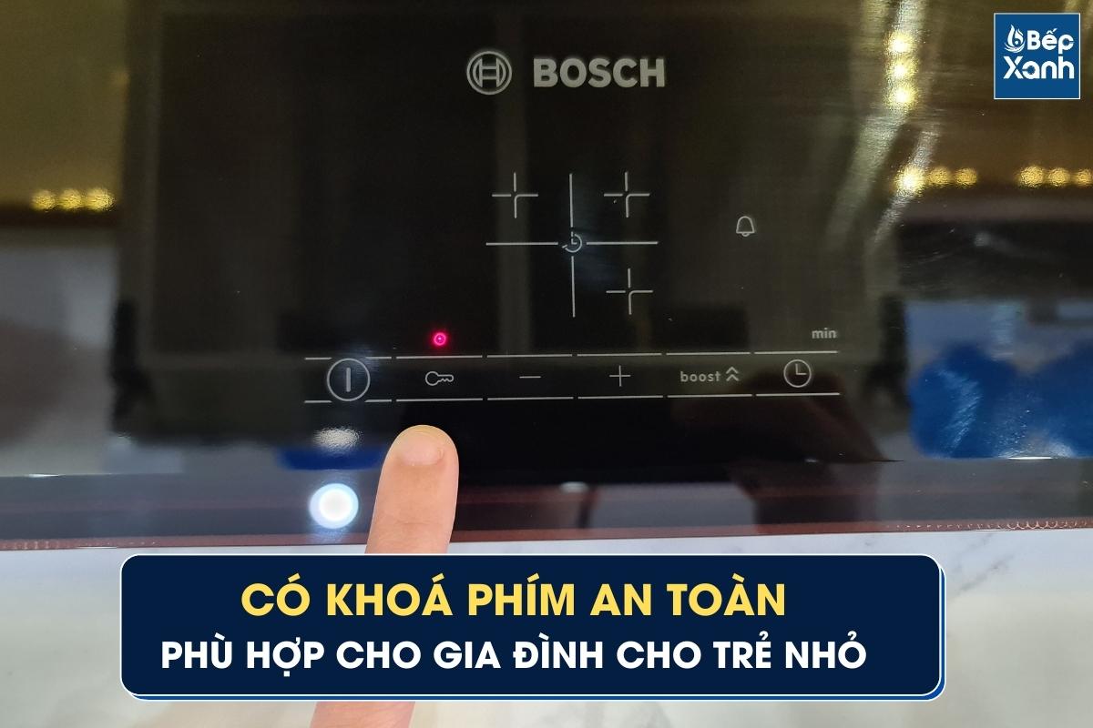 Ngay trên mặt bếp từ Bosch có ký hiệu khoá để bạn kích hoạt chức năng này. Chỉ cần ấn và giữ 3 giây, phím khoá sẽ được bật và lúc này bạn không còn điều khiển bếp được nữa. Tính năng rất tiện lợi khi bạn cần vệ sinh mặt bếp mà không muốn làm bảng điều khiển nhảy số lung tung, hoặc ngăn trẻ em chạm tay vào sử dụng bếp để đảm bảo an toàn hơn.