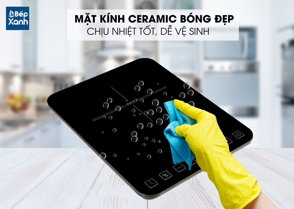 Mặt kính Ceramic bóng đẹp: Bếp có mặt kính Ceramic chịu nhiệt, luôn bóng đẹp trong quá trình nấu nướng.